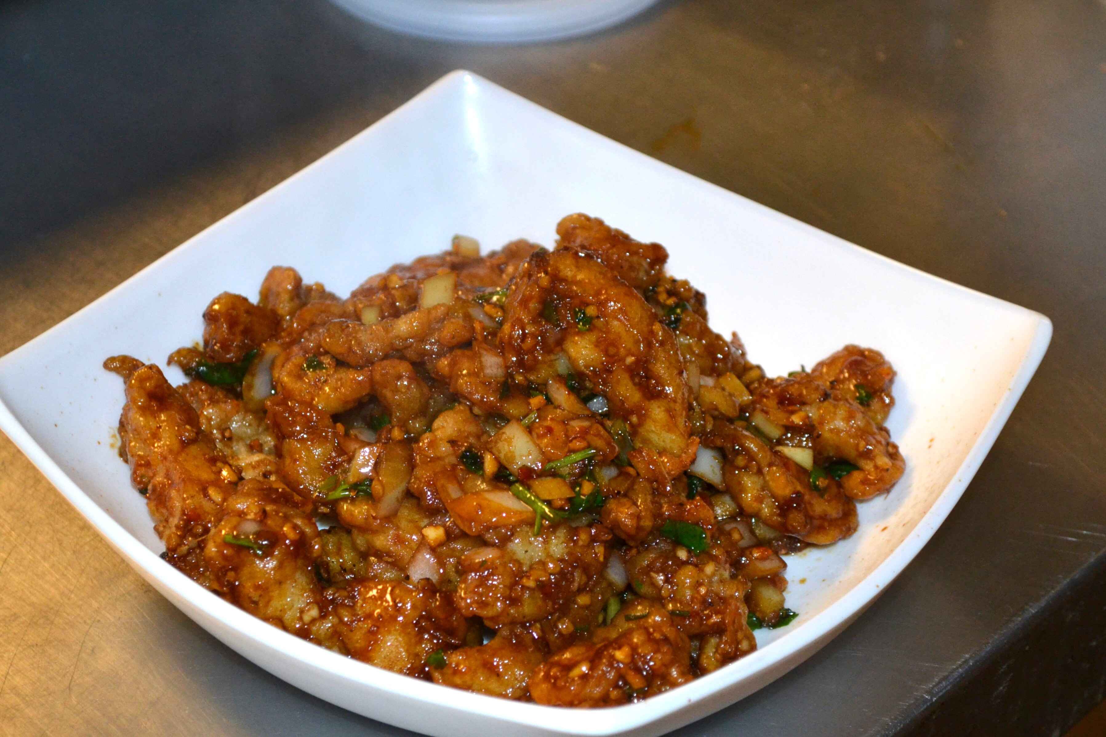 Tiger shrimp tossed with chopped chicken in lobster flavour sauce